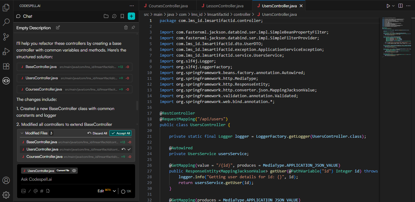 - Accept All Changes: Commit the suggested edits across every file in one action.